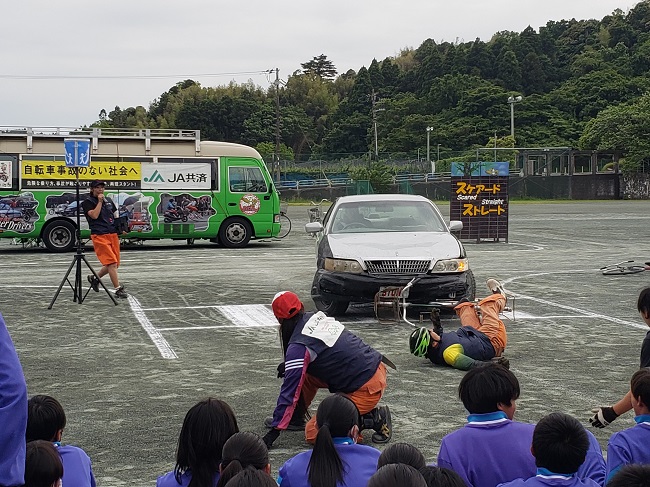 スタントマンは、手放し運転や見通しの一時不停止による事故などを再現し、交通ルールを守らないために起きる事故の怖さを伝えました。