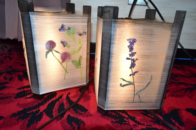 はじめに、クイズを交えながら蚕の知識について学びました。その後の製作作業では、お湯につけた繭玉から糸をひき、ランプの枠に巻いてから押し花などで模様をつけ、また糸を巻きつけるという作業を続けて完成となります。最後に明かりを灯すと、とても素敵なランプシェードが出来上がりました。