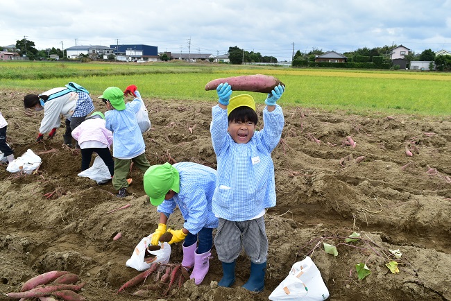 園児たちは、「大きいお芋がとれたよ!」と見せてくれたりいっぱいになったビニール袋を持ち上げて「重たい!」とたくさん笑顔を見せてくれました!