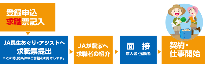 農作業のお手伝いをしていただける人がJA長生あぐり・アシストに援農求職者として登録します。