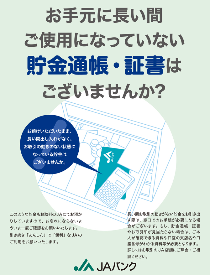 お預入れいただいたまま、長い間出し入れがなく、お取引の動きのない状態となっている貯金はございませんか。お忘れにならないよう今一度ご確認をお願い致します。