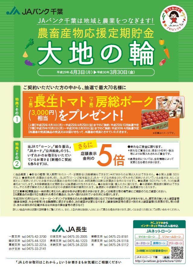 〈 商品概要 〉 ◆貯金の種類:預入期間1年のスーパー定期貯金(自動継続もできます)*ATMからのお預け入れはできません。 ◆お預入金額:50万円以上 ◆適用金利:店頭表示金利。但し、当JAで「ローン」「給与振込」「JAカード」「公共料金」のいずれかをご契約いただいているお客さま、もしくは新たにご契約いただいたお客さまは店頭表示金利の5倍(なお、初回満期日以降は店頭表示金利となります)。 ◆抽選権:50万円につき、1口の抽選権をおつけします。※自動継続後の定期貯金には抽選権は付与されません。 ◆お取扱対象:個人の方に限ります。 ◆中途解約:期限前の解約はできません。やむを得ず解約された場合は所定の中途解約利率が適用されます。 抽選前に中途解約するときは、抽選権がなくなります。