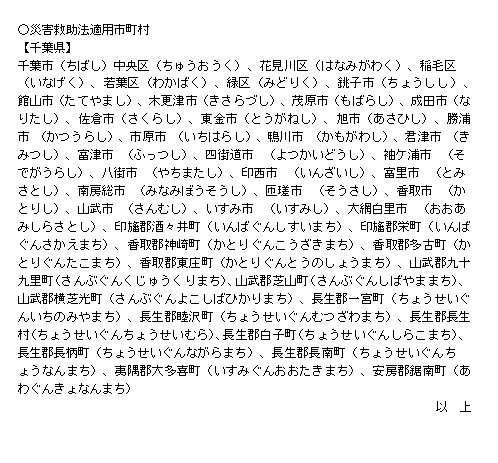 令和元年台風第15号の影響による停電により被害にあわれた皆様に対しまして、心からお見舞い申し上げます。