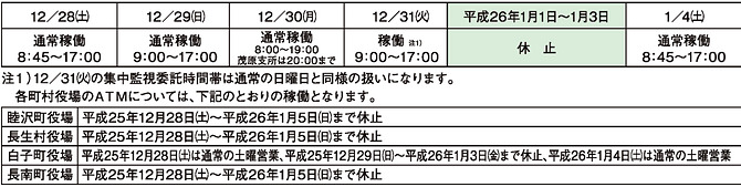 ※各町村役場のATMについては、平成25年12月28日(土)~平成26年1月5日(日)までの間は休止となります。※但し、白子町役場ATMについては平成25年12月28日(土)・平成26年1月4(土)は通常の土曜営業となります。