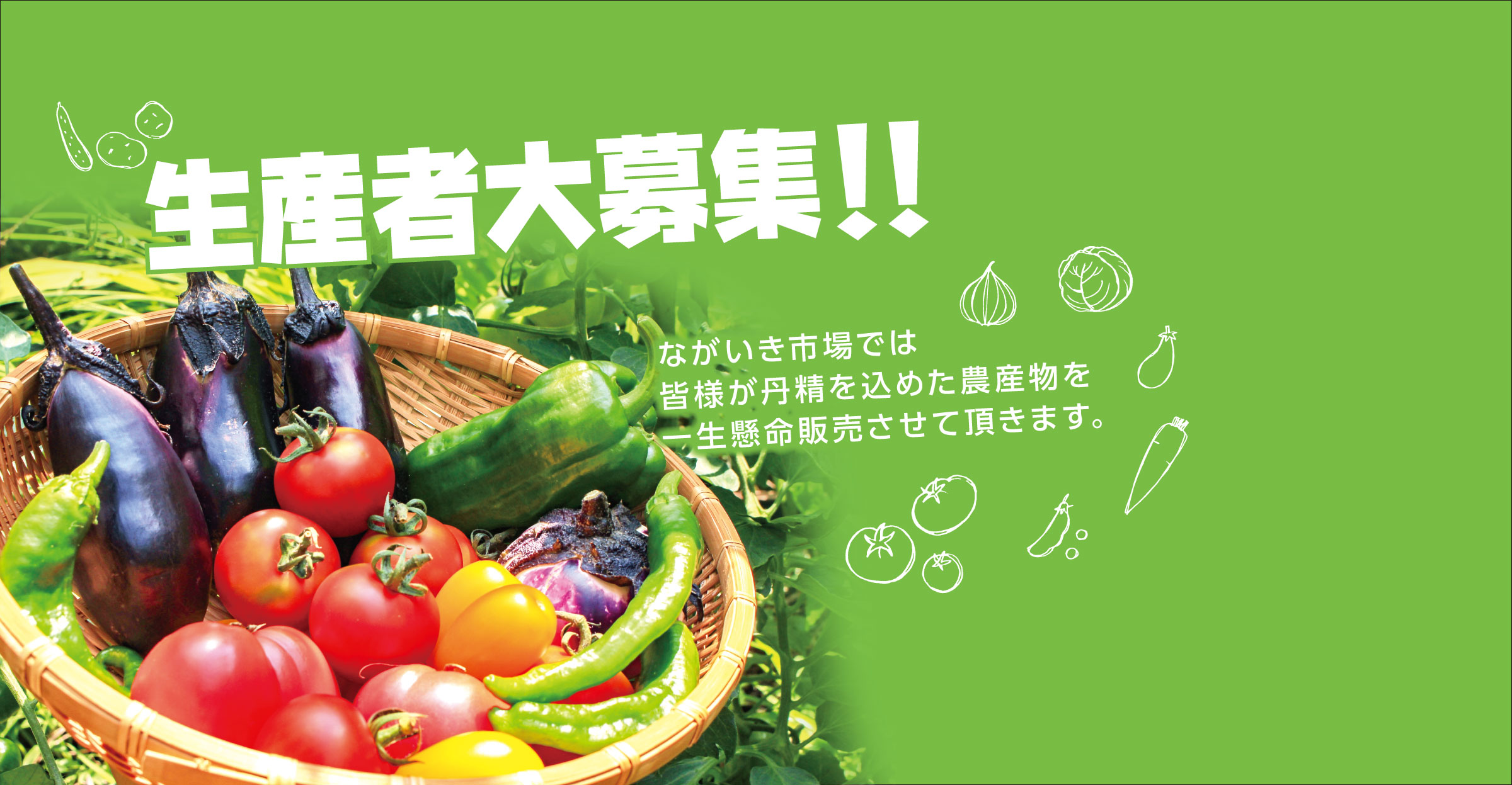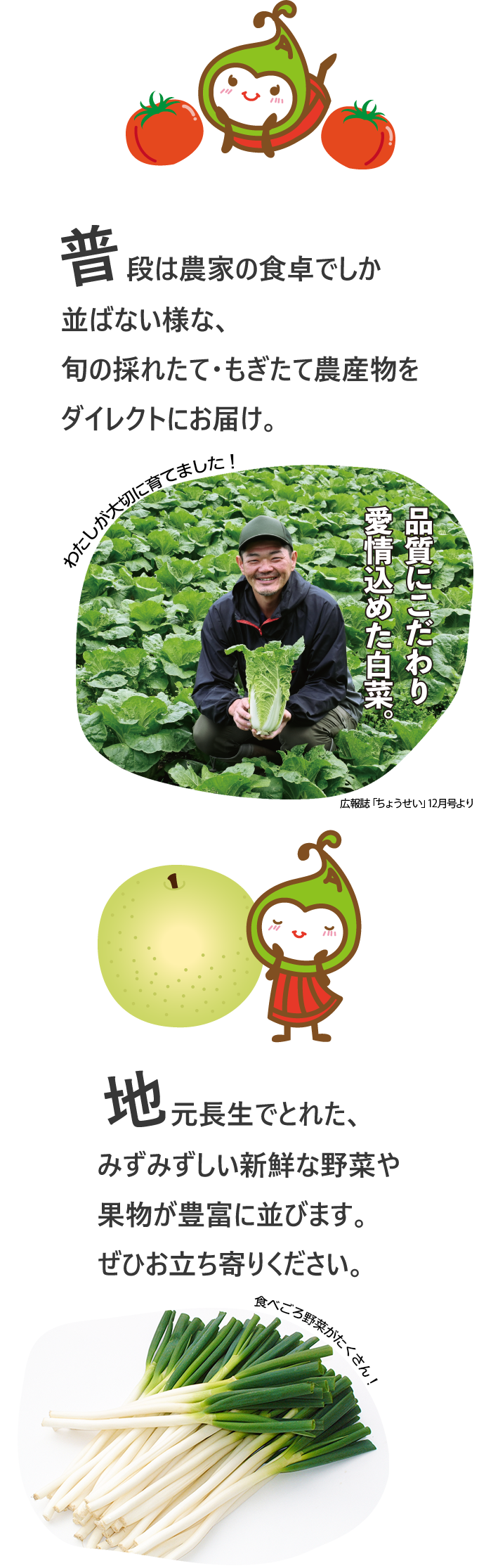 地元長生でとれた、みずみずしい新鮮な野菜や果物が豊富に並びます。ぜひお立ち寄りください。