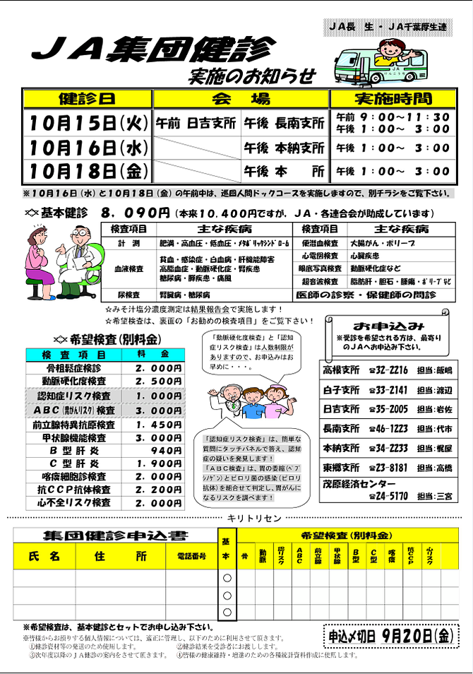 10月15日(火) 日吉支所 午前 9:00~11:30 長南支所 午後 1:00~3:00