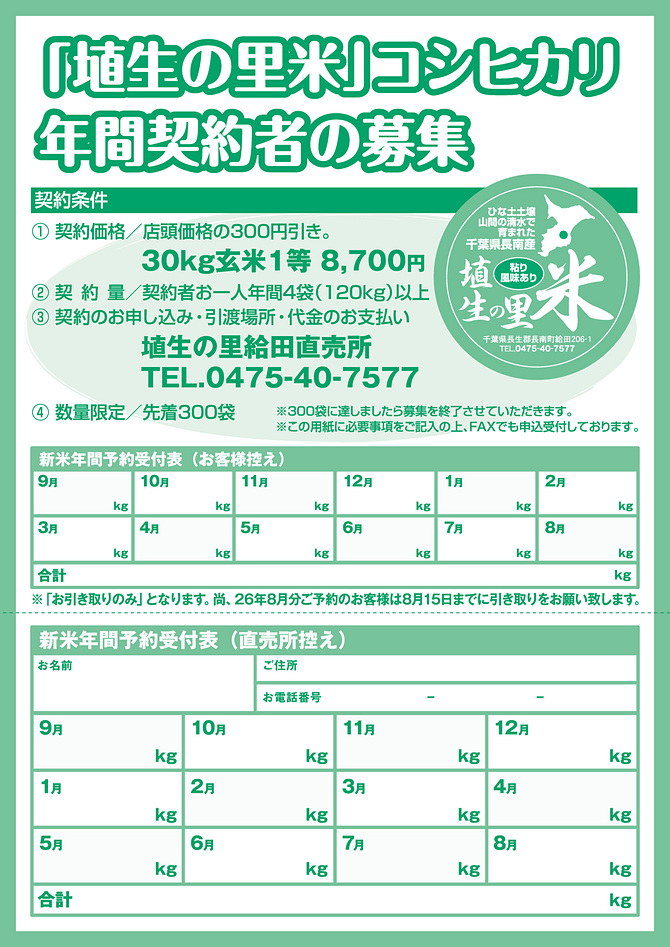 コシヒカリ(30㎏1等玄米):9,000円 ※年間契約の方は8,700円