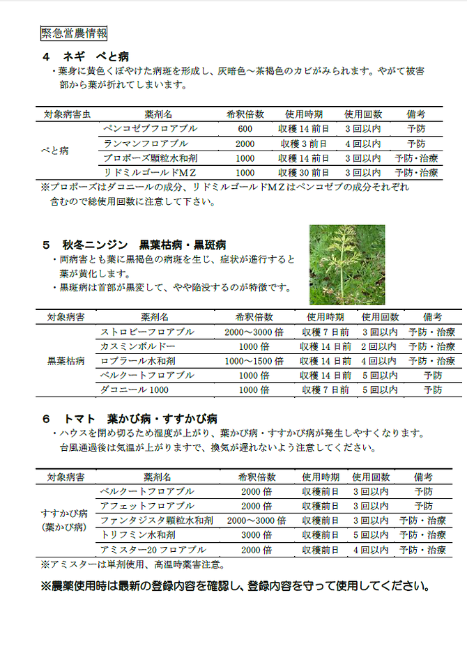 10月5日以降、大型の台風18号が関東地方に接近・通過すると予想されています。台風の接近に伴い、圃場の冠水・作物の損傷・高温多湿による病害の発生が予想されますので、十分注意してください。