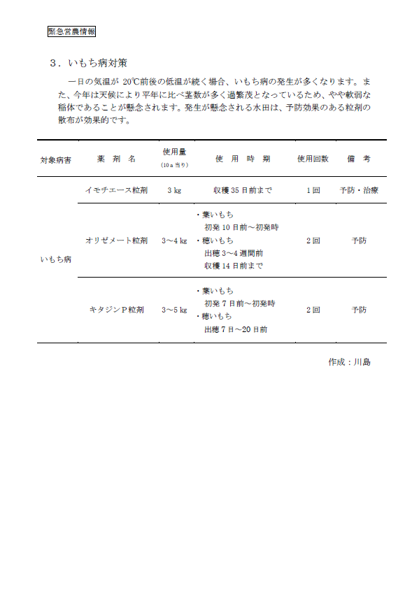 現在関東甲信地方では6月20日ごろから約1週間の間、気温が平年よりかなり低くなるとの予報が示されておりますので、緊急営農情報として水稲の低温・天候不順対策についてお知らせいたします。