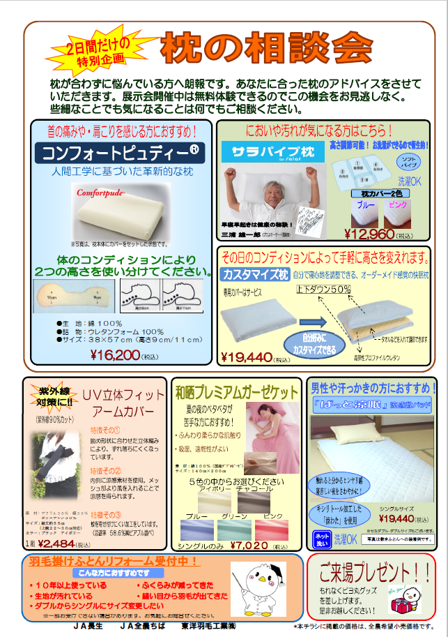 ~6/3(金)・6/4(土)JA長生本所で寝具&枕の快眠フェアを開催いたします~