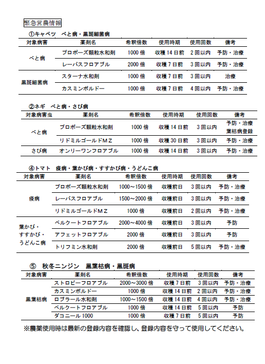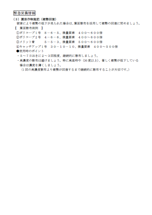 現在発生している台風16号は20日(火)から21日(水)未明にかけて関東地方を通過する可能性があります。台風の影響により圃場の冠水・作物の損傷・高温多湿による病害の発生が予想されますので、お気を付けください。