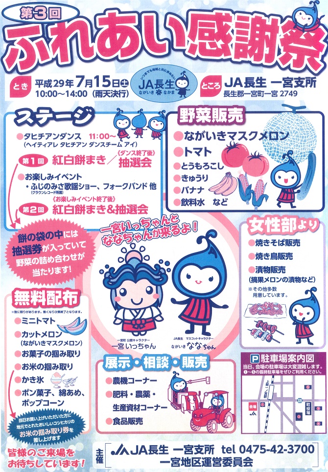 会場には、JA長生マスコットキャラクター ながいきななちゃんと、一宮町公認キャラクター 一宮いっちゃんが遊びに来ます♪