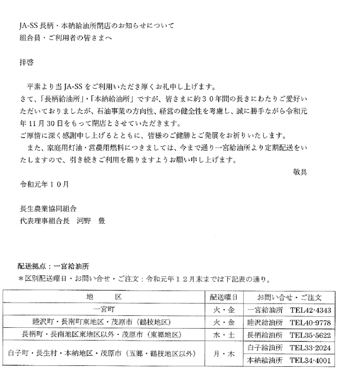 JA-SS長柄・本納給油所閉店のお知らせについて