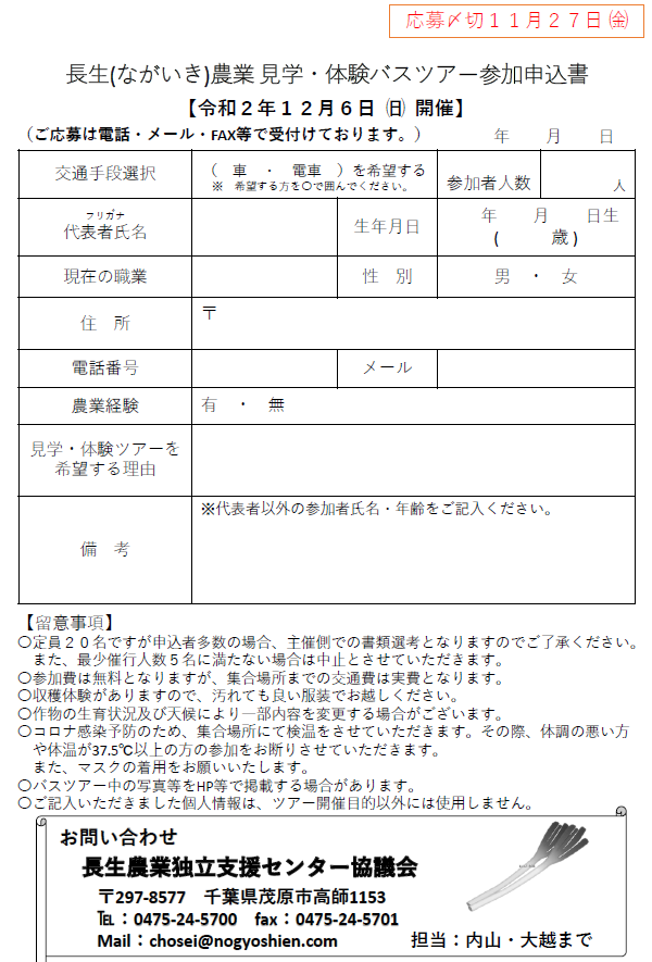 お申し込みは、長生農業独立支援センターまで!TEL:0475-24-5700