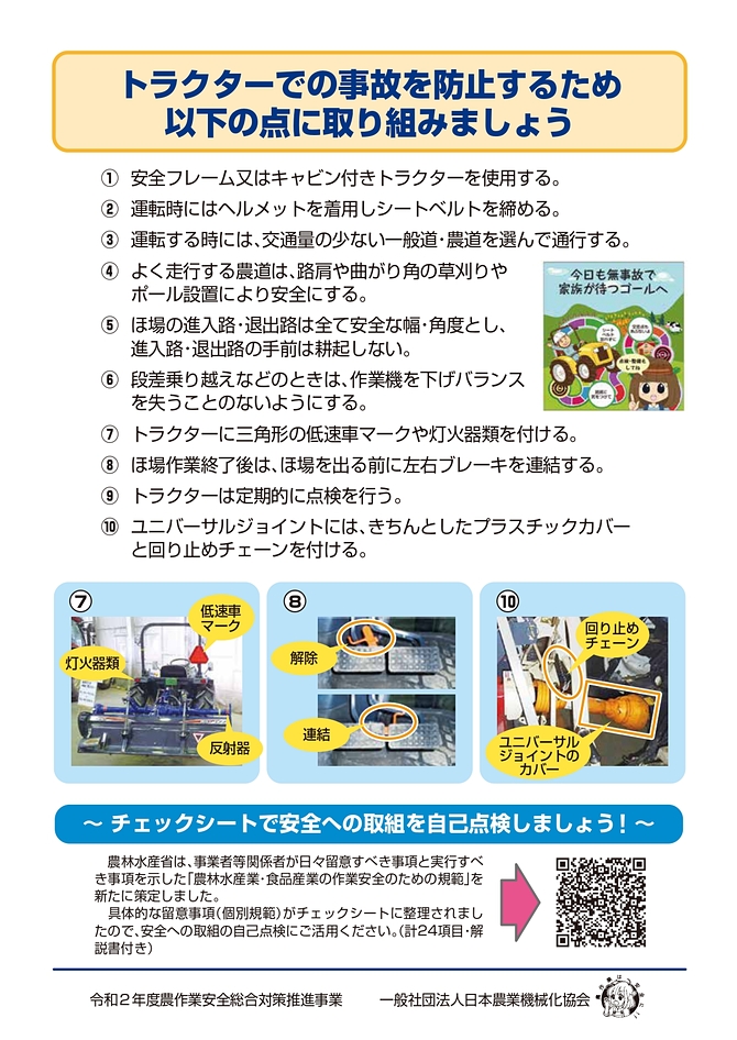 乗用型トラクターなどの農業機械による交通事故では、シートベルトを着用していない場合、およそ4人に1人がなくなっています。