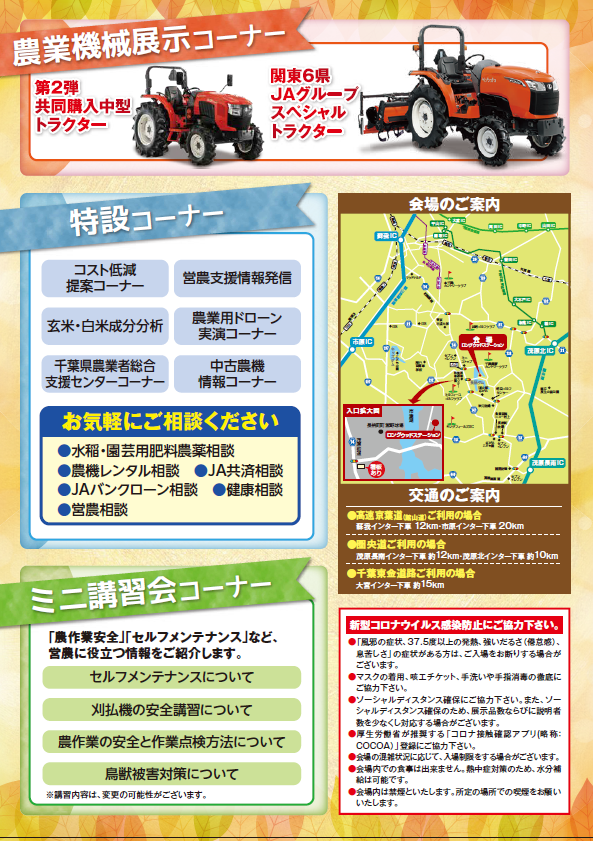 10月20日(木)・21日(金)・22日(土)の3日間、農業機械大展示会を開催します! 場 所:ロングウッドステーション(長生郡長柄町山之郷67-1) 時 間:9:00~15:00(22日(土)のみ14:30まで)