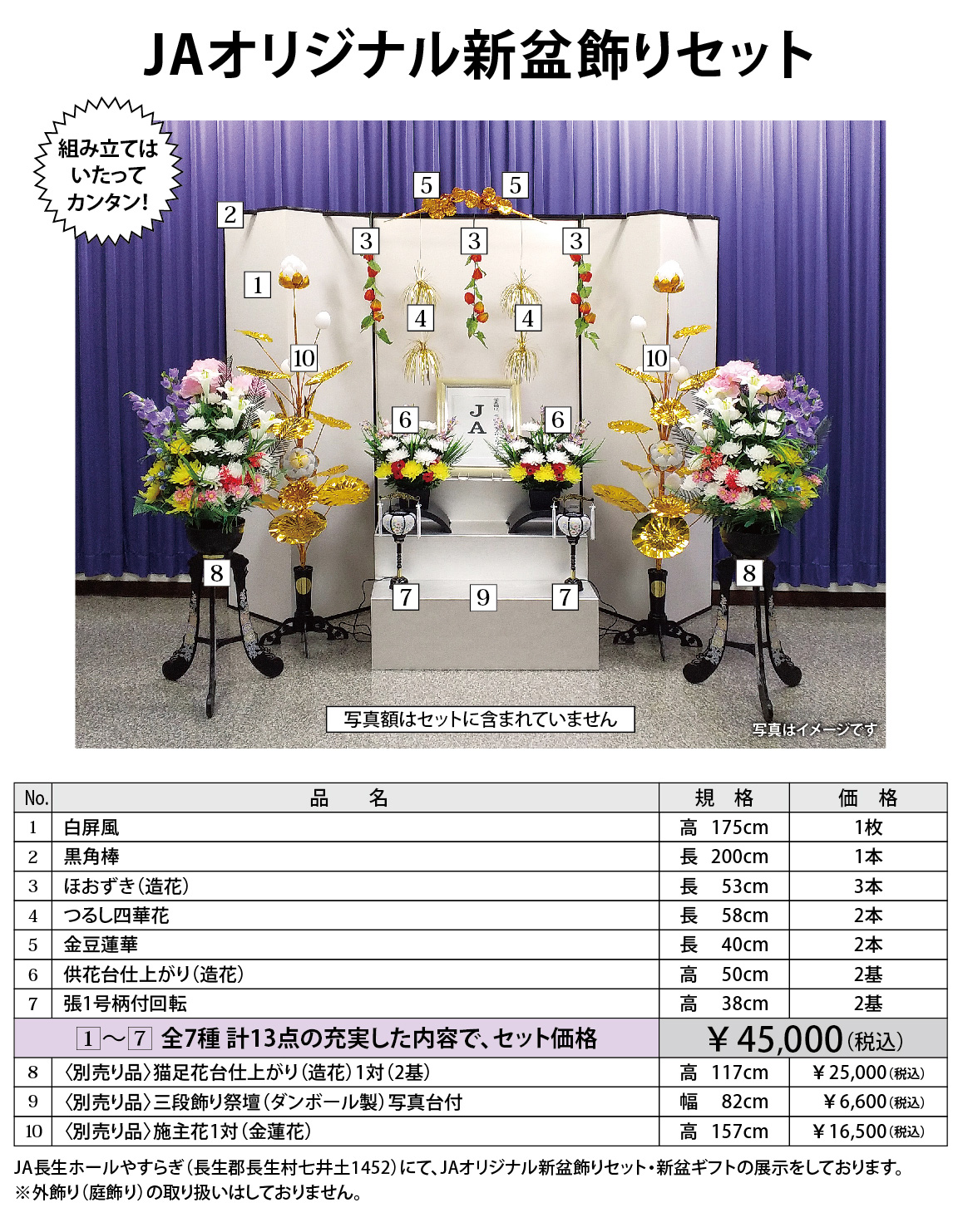 JA長生ホールやすらぎ(長生郡長生村七井戸1452)にて、JAオリジナル新盆飾りセット・新盆ギフトの展示をしております。※外飾り(庭飾り)の取り扱いはしておりません。