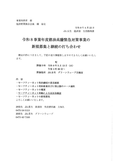 令和8事業年度燃油高騰緊急対策事業の新規募集と継続の打ち合わせを下記の通り開催いたします。