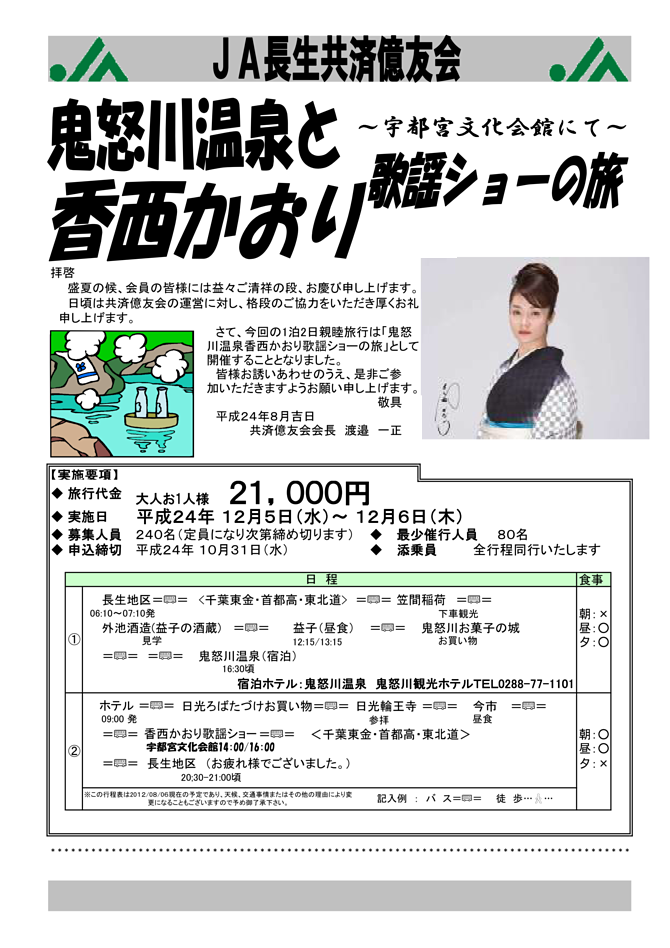【共済億友会】鬼怒川温泉と歌謡ショーの旅(申込終了)
