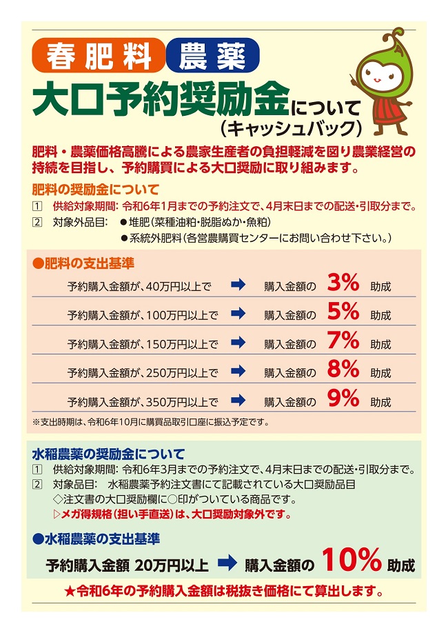 令和6年 春肥料・農薬大口予約奨励金振込のお知らせ