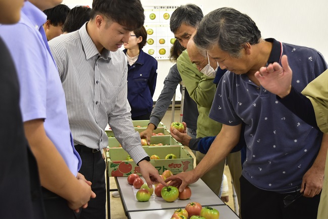 JA長生施設野菜部会は、令和6年産越冬期トマト査定会を開催し、生産者、JA全農ちば、長生農業事務所、市場関係者、JA役職員ら約40名が参加しました。査定会では、情勢報告や販売方針及び出荷留意点などについて協議しました。その後行われた現品査定では、出荷できるものとできないものに分け、生産者らはトマトを手に取りながら出荷基準を再確認しました。