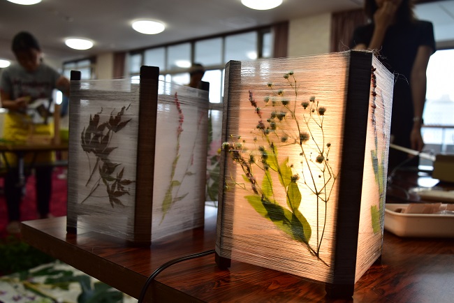 JA長生女性部は、女性部短期大学校第6回講座を本所にて開催し、短大生16名と女性部役員が参加し、繭から作るランプシェード作りを行いました。繭玉から糸をひき、ランプの枠に巻いてから押し花などで模様をつけ、また糸を巻きつけるという作業を続けて完成となります。最後に明かりを灯すと、とても素敵なランプシェードが出来上がりました。