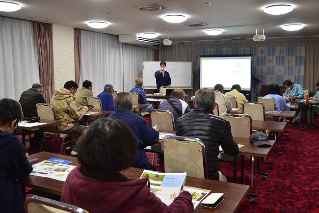 ながいき市場生産者を対象に第6回目の栽培講習会を開催し、生産者19名が参加しました。雪印種苗(株)の中村氏を講師に招き、緑肥の特徴と野菜品種紹介について講義が行われました。緑肥作物で水はけや土壌改良、病害虫対策が行えることのお話と枝豆やトウモロコシの品種特徴や栽培の注意点の紹介があり質問も多く寄せられました。