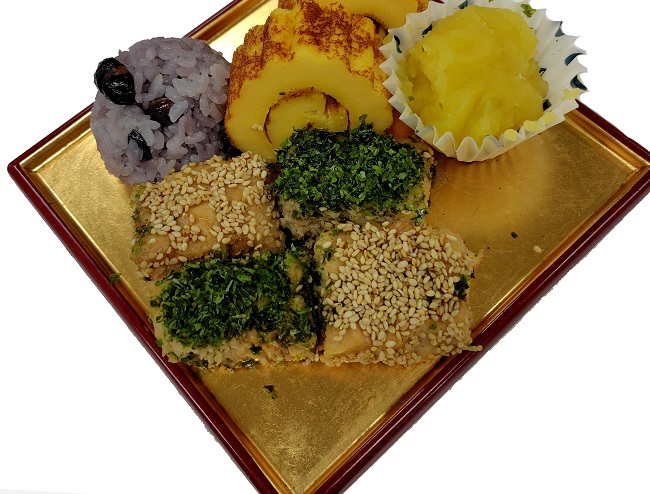 短期大学校第8回講座としておせち料理作りが、白子町健康づくりセンターにて開催されました。今回の講座では、身近にある食材で簡単に作れるのし鶏、黒豆ご飯、伊達巻、りんごきんとんの4品を作りました。短大生は4~5人のグループに分かれ、手際よく調理を行い見た目もきれいに出来上がりました。