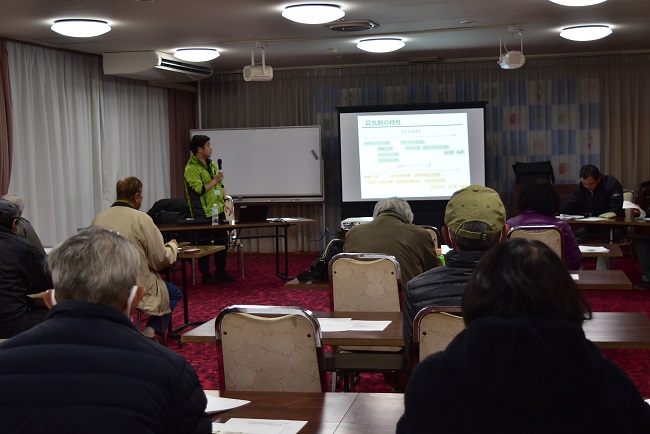 JA全農千葉の根本氏を講師に「食の安全・安心について」、「殺虫剤の効き方・チョウ目害虫について」と題して講義を行いました。農薬に係る法律や農薬使用から出荷までの対策、事故の原因、不適正使用による事故を防ぐことを改めて確認しました。また、殺虫剤の種類と特性などが紹介され、生産者は熱心に聞き入っていました。
