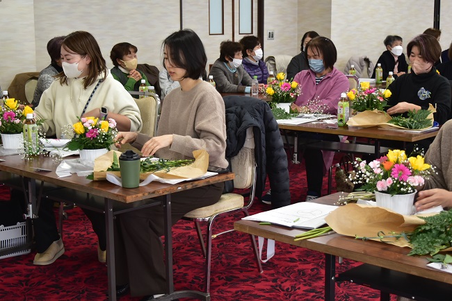 女性部短期大学校第10回講座のフラワーアレンジメントを本所にて開催し、バラやカスミソウなどを使用して春らしい鮮やか作品が完成しました。
