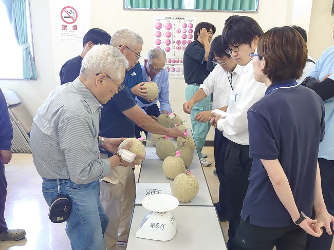 JA長生施設野菜部会アールスメロン部は、グリーンウェーブ長生にて令和7年産アールスメロンの査定会を開き、生産者、市場関係者、JA役職員ら約30人が参加しました。本年産は、収穫前の高温で生育に若干影響が出たものの生産者の努力と技術で出荷に向けて順調に生育しています。