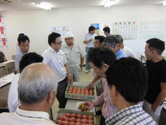 販売会議では、販売方針や高温下での栽培管理、出荷留意点、現品査定を行いました。しっかりとしたトマト作りを念頭に、味や色回り、鮮度などを留意した「品質の高いトマト」の生産、販売に取組むことを再確認しました。