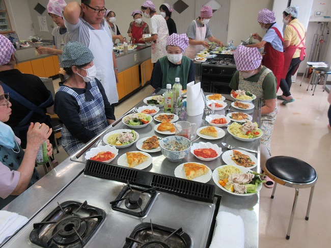今回の講座では、エーコープの商品を使って麺料理など4品を作りました。短大生らは、グループごとに分かれ手分けをしながら調理を進めました。あっという間に4品が完成し、和気あいあいとしながら交流を深めました。