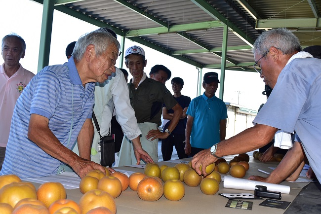 目揃え会では、出荷規格の確認や出荷時の注意事項の説明を受けました。その後行われた現品研修では、持ち寄った梨を規格ごとに分け、生産者らは梨を手に取りながら色回りや形状について確認しました。