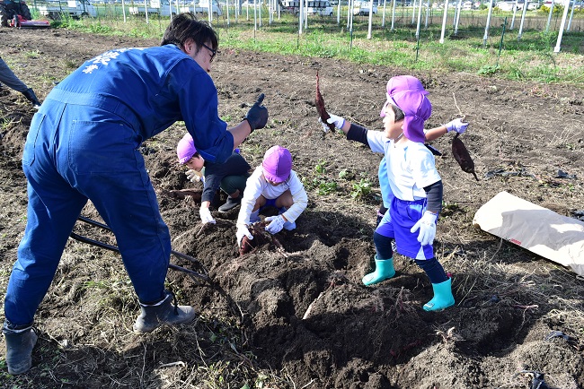 部員らは土を持ち上げてあげたり、「こっちにもお芋があるよ!」と声をかけたりしながら一緒に楽しみました。園児たちも圃場の中のさつまいもを一生懸命探し、「ここにもあった!」と笑顔を見せました。