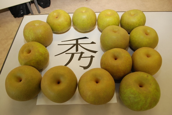 生産者が持ち寄った梨で、現品研修を行い、市場担当者は「選果に気をつけ、出荷規格どおりにお願いします」と呼びかけました。