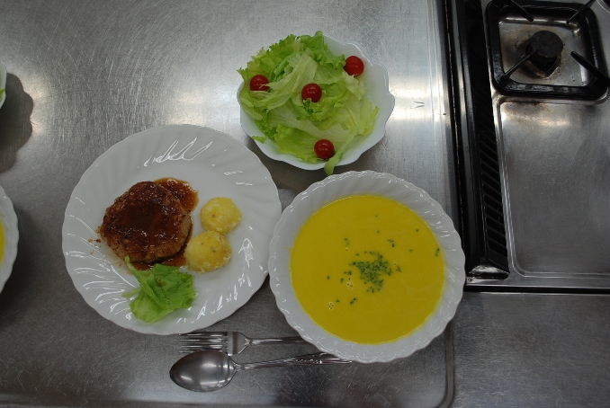 JA職員が講師となり、子供達が大好きな「ハンバーグ」と、旬のカボチャを使った「カボチャのスープ」、「レタスのしゃきしゃきサラダ」の3品を作りました。
