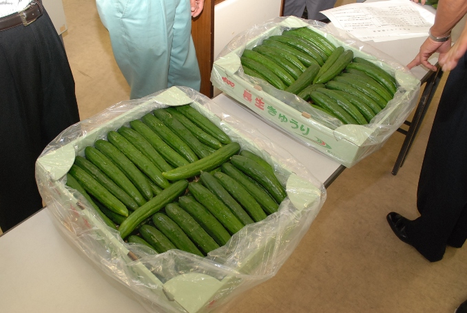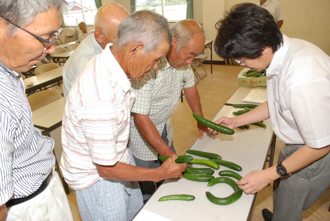 JA長生管内の抑制キュウリの出荷が9月9日から始まり、本格出荷を前にJA長生施設野菜部会抑制キュウリ部は9月10日に査定会を開きました。 他産地の情勢や販売方針、出荷留意点を再確認しました。また、サンプルで用意したキュウリを規格内、規格外に分け、生産者はそれらを手に取り確認しました。 抑制キュウリ部は、良品質の栽培と、安定出荷を心がけ組織一丸となり、有利販売を目指すことを申し合わせました。 出荷をは11月まで予定しています。