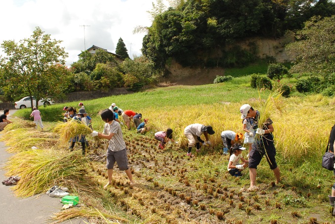 5月に田植えをした20組の親子は、鎌で稲を刈りました。手刈りをするのが初めての人がほとんどで、慣れない手つきで作業をしていました。