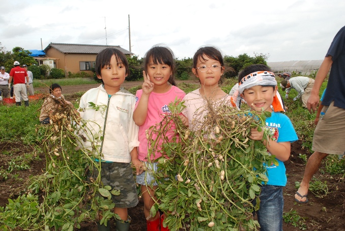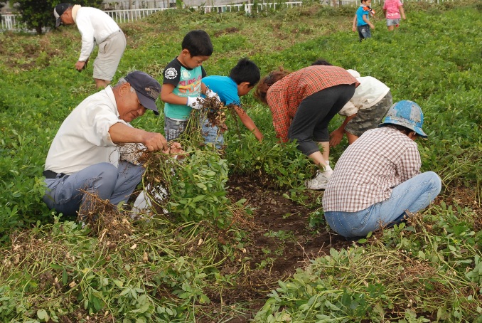実りの秋、白子町の農家の経営主で構成する耕友会は9月28日、白子町立関保育所園児と保護者を招き、5月30日に同保育所園児らが播いた落花生「おおまさり」の収穫体験をしました。