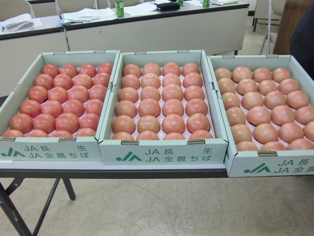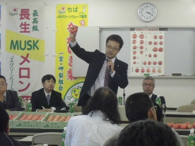 越冬トマトの本格出荷を前に、JA長生施設野菜部会越冬トマト部は10月25日、生産者、市場担当者らが出席し越冬トマトの査定会を開きました。 他産地の情勢報告や販売方針、出荷留意点などを確認しました。現品研修も行われ、大きさ・着色・裂果などの出荷規格と品質を生産者らは現物を手に取りながら再確認しました。 部会では、昨年の反省点を踏まえ、しっかりとした数量目標、計画を立て、積極的な栽培管理で数量確保を行い、有利販売と所得向上を目指すことを申し合わせました。