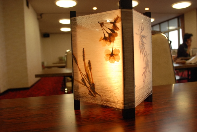 JA全農ちばシルクセンターの岩瀬智彦センター長が講師となり、蚕と繭の話をクイズ形式で行い、蚕と繭について知る事ができました。次はランプシェード作りです。桶に入っている繭を小さな竹ほうきで突いて糸を引き出し、何本もの糸をあんどんワクに絡めていきます。そこに、押し花などをはさみ、さらに糸を絡めていきます。最後に電球を取りつけて完成です。