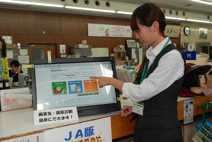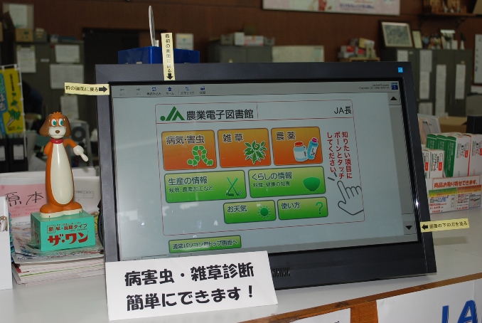 また、各支所窓口とグリーンウェーブ長生に、営農情報とJA長生独自の情報が関連しているタッチパネル端末「JA長生版 農業電子図書館」を設置しました。画面をタッチするだけで簡単に農薬や病害虫を検索できますのでぜひご利用して下さい。