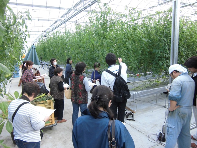 11月26日、JA長生施設野菜部会養液トマト部の婦人を対象に第1回トマトセミナーが行われました。 セミナーでは養液栽培農家2軒を視察し、各視察先で栽培システム、環境制御についての説明や、効率的な作業方法と管理作業、使用資材についての紹介がありました。 視察後はグリーンウエーブ長生2階会議室にて講習会があり、長生農業事務所より収量増加の仕組みや、産地の今後の取り組み、安全面での注意等についての説明がありました。