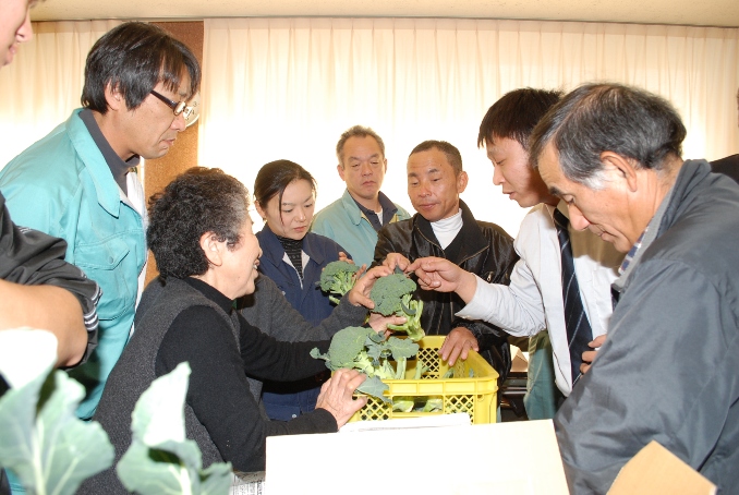 JA長生管内のブロッコリーの出荷の最盛期を迎える前に、JA長生白子支所で「ブロッコリー査定会」を開きました。 生産者、市場関係者、JA全農ちばら16人が出席し、他県の情勢や出荷計画、出荷留意点を協議しました。 今年産は台風や急激な寒さの影響で生育は遅れ気味だが、生育は順調です。現品査定では生産者と関係者が、現品を手に取りながら規格や出来具合いを確認しました。