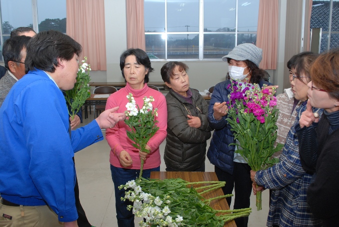 スプレーストックの本格出荷を前に、ながいき花倶楽部は12月19日、「スプレーストック査定会」を開きました。生産者、市場担当者らが出席しました。 今年は夏場の猛暑と11月に入って急激の冷え込み等で平年より生育が遅れ気味です。 査定会では、情勢報告や出荷留意点、出荷規格を確認し、現品査定は、生産者が持ち寄ったストックを1本1本枝ぶりや花のつき方、花の色などを目合わせました。 市場担当者は「規格の厳守と早めの出荷を心掛けてほしい」と呼びかけました。