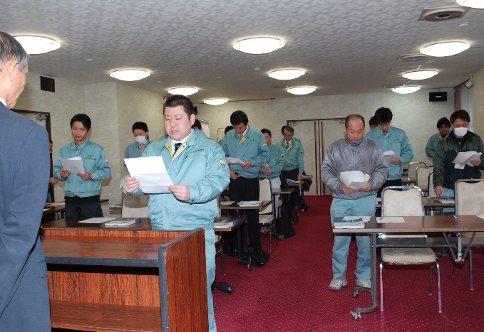 1月9日、本所で「指導経済課兼担い手担当者進発式」を開催し、担い手担当者、担い手責任者ら26人が出席しました。 担い手担当者は、農家組合員との結びつきを深め、農家に役立つ「情報」「商品」「サービス」の提供や、相談活動を通じて農家の「信頼」を得られるように努めます。 進発式では、目標確認や決意表明を担当者代表が読み上げ、担い手の身近なパートナーを目指すことを確認しました。