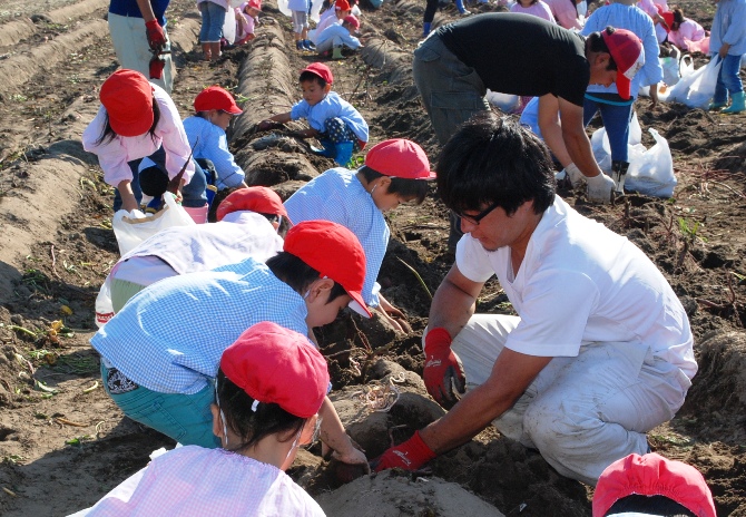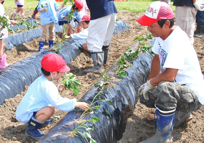 また、地元の子供たちに食育の大切さと農業の楽しさを知ってほしいと、毎年園児にサツマイモの苗植え・芋掘り体験を行っています。【写真掲載】