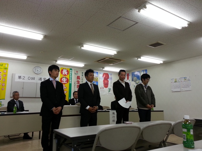 総会では、高島康輔氏を議長に選出し、3議案全て可決・承認しました。3号議案の役員改選の件で、新青年部長に石和田喜明氏を選出しました。