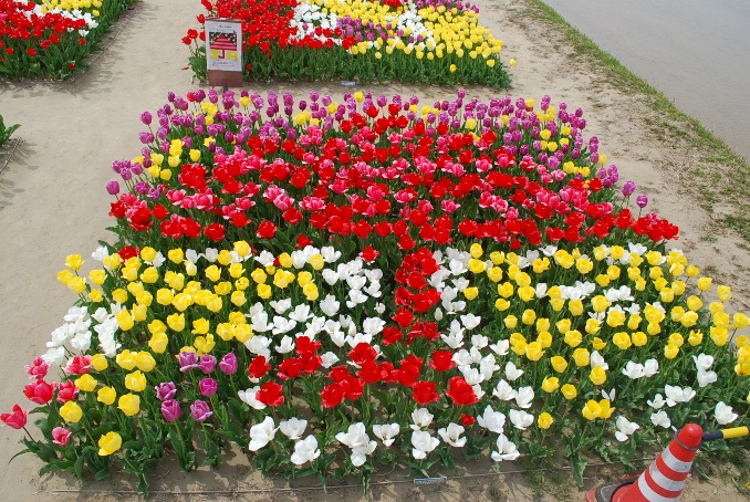 祭りは、球根60球を1区画としてオーナーを募り植付けや除草の管理をします。また、団体オーナーもあり1区画に5色900球でデザインを作り、団体模様植えコンテストを行います。今年もJA長生白子支所が出場し、地域の皆様の安全を守っていく傘のような存在でありたいと傘をモチーフにデザインし、準優勝に輝きました。デザインを考えた職員は「デザイン通りにチューリップがきれいに咲き、準優勝になってうれしい」と笑顔で話しました。